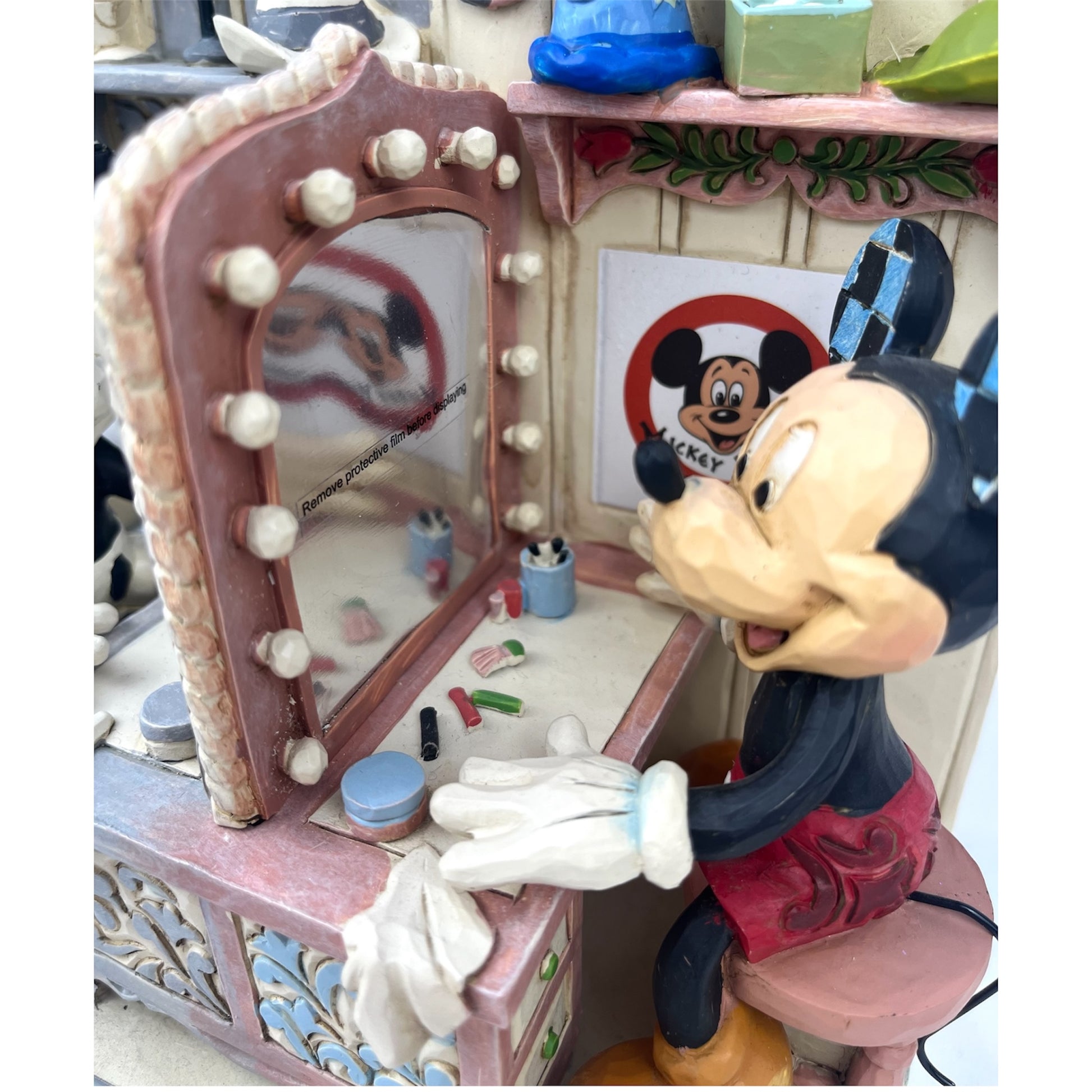 ドレッサールームで準備をしているミッキーが、左半分は白黒時代のデザインで、右半分は現代のデザインになっているよ☆